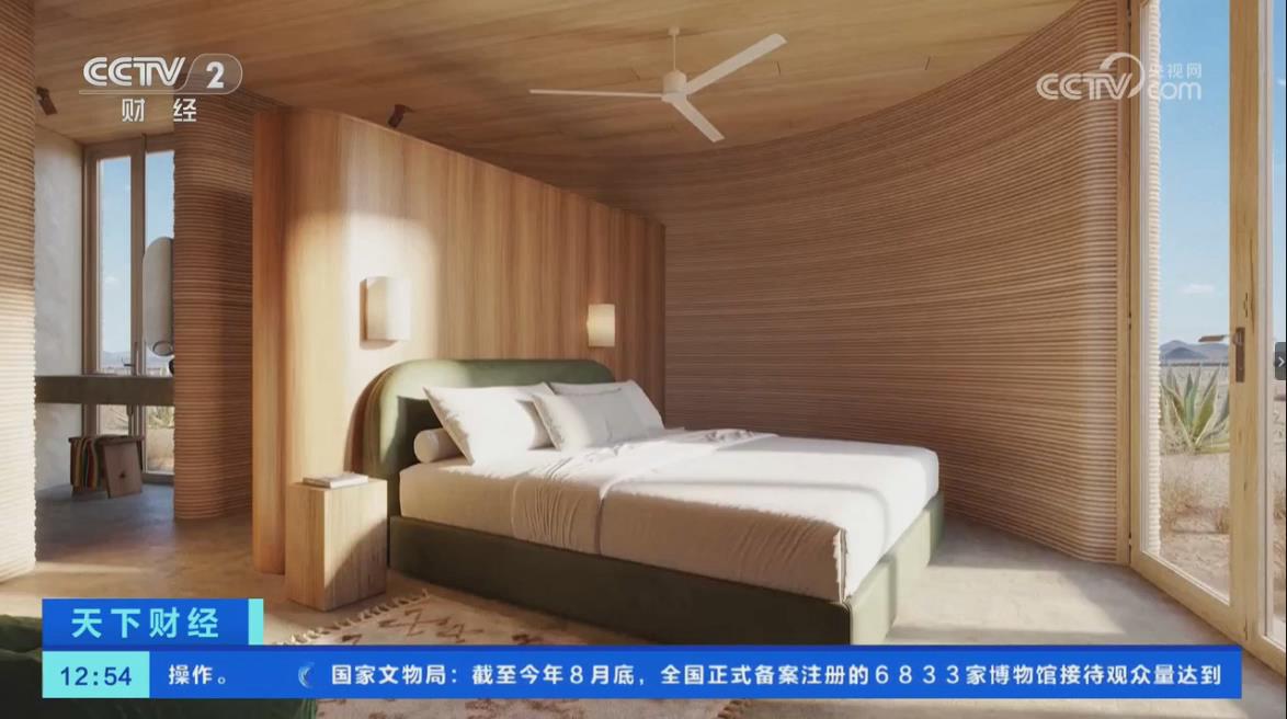 2024年9月30日,近日央视二套财经频道报道美国正在沙漠中3D打印酒店,预计将于2026年完工,最终占地面积将达25万平方米,共包括43个一居室的酒店单元,和18个3-4居室的酒店式公寓。其中一居室酒店住宿价格在每晚200美元到450美元之间,约合人民币1,400元到3,160元。