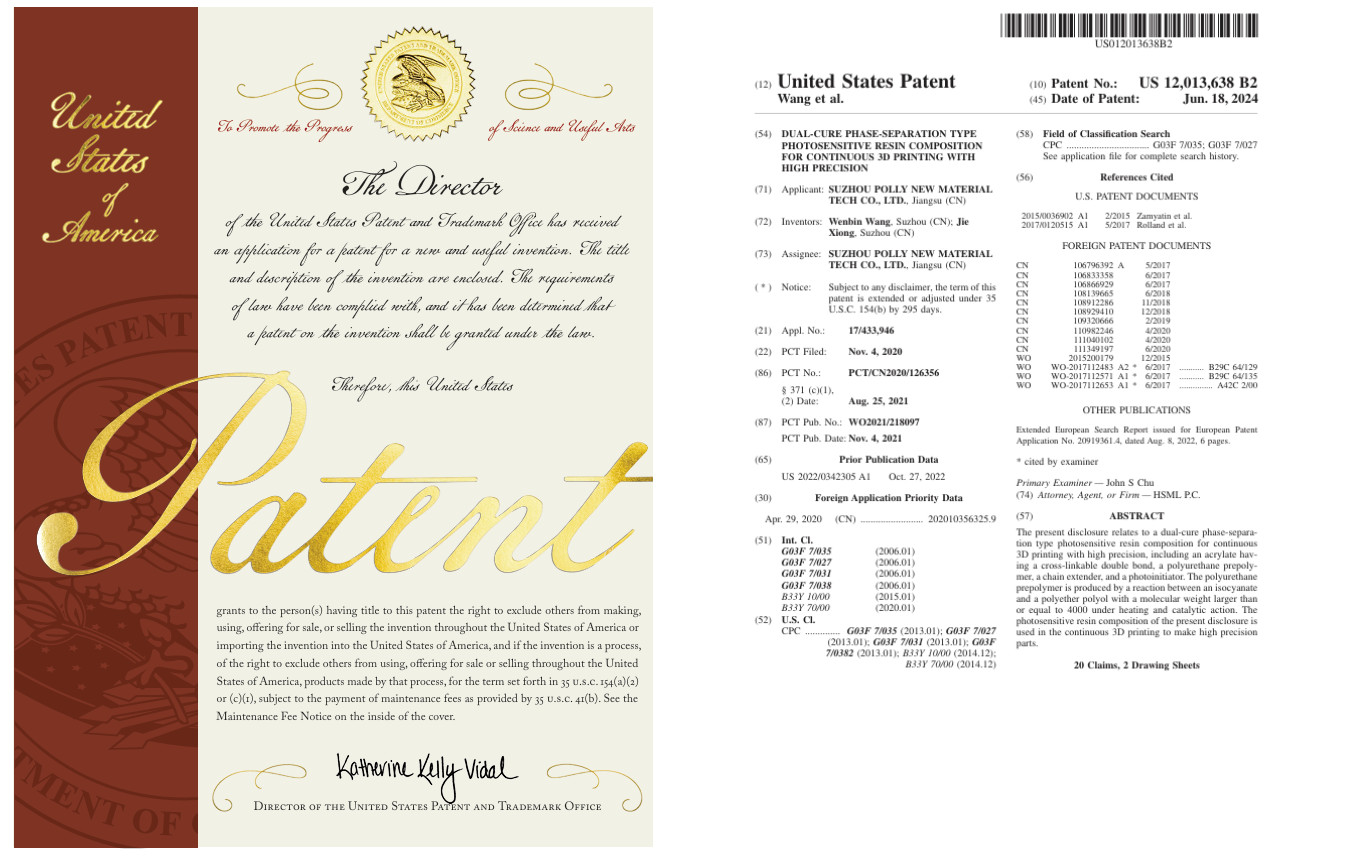 2024年10月底,博理科技申报的DUAL-CURE PHASE-SEPARATION TYPE PHOTO SENSITIVE RESIN COMPOSITION FOR CONTINUOUS 3D PRINTING WITH HIGH PRECISION(用于高精度连续3D打印的双固化相分离型光敏树脂组合物)专利获得美国专利授权。