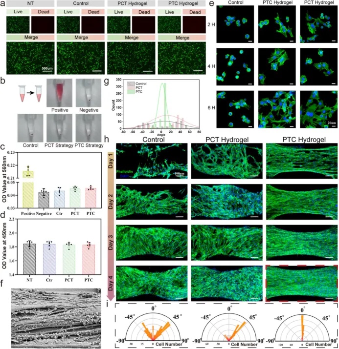 细胞实验表明,坚韧水凝胶支架不仅具有良好的生物相容性,并且能够显著促进细胞黏附。并且在4天内可有效诱导C2C12细胞定向生长。