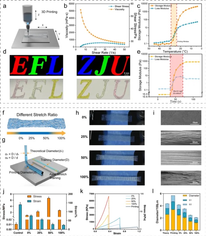 图4 坚韧水凝胶支架的可打印性及拉伸比例的影响