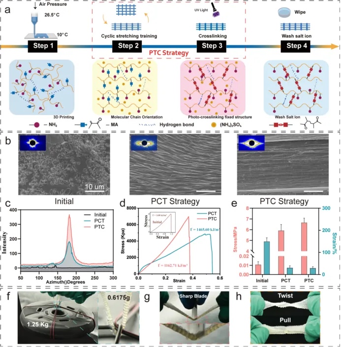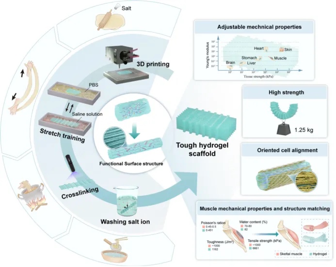 研究者首先通过3D打印制备具有多孔和定制结构的水凝胶支架,随后在训练中,将水凝胶放在硫酸铵溶液中反复拉伸。通过盐析进行相分离,硫酸铵取代水分子的位置,在水凝胶支架表面和内部形成定向微观结构,促进水凝胶分子链有序排列。然后将水凝胶置于PBS溶液中释放预拉伸,并从水凝胶中释放硫酸铵,以确保水凝胶支架的生物相容性。经过几轮训练,研究者构建了具有功能表面结构的强韧的水凝胶支架。