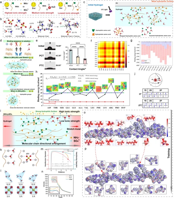 进一步,研究者研究了水凝胶支架在硫酸铵溶液中拉伸训练时的强化机制。带电残基之间的相互作用可以提供特异性。在训练过程中,水凝胶分子链的结合顺序与结合物质的电荷强度有关。硫酸铵离子强度最高,首先与亲水分子链结合。因此,在拉伸训练过程中,由于结合能低于配位的强化结合能,H2O被SO42−配位强化。随着拉伸过程的继续,分子链在拉伸应力的作用下变得更加紧密,并沿拉伸方向定向。当SO42−的配位能高于水分子的配位能时,原来与分子链结合的水分子会被SO42−所取代。由于离子强度和结合能的变化,水分子逐渐从GelMA分子链上解离(图3i),使其密度增大,实现了水凝胶支架的强化过程。研究者通过分子动力学进一步验证了上述观点。综上所述,高取向度分子链与致密的分子链网络协同显著增强了水凝胶支架的力学性能。