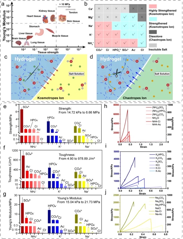 有趣的是,该策略可以通过改变盐的类型产生机械性能为10 kPa-10 MPa的仿生人体组织力学性能的坚韧水凝胶支架,并且许多水凝胶,如明胶和丝素蛋白水凝胶,可以通过这个策略得到改善,显著提升其力学强度或断裂延展性。