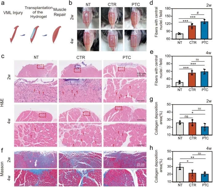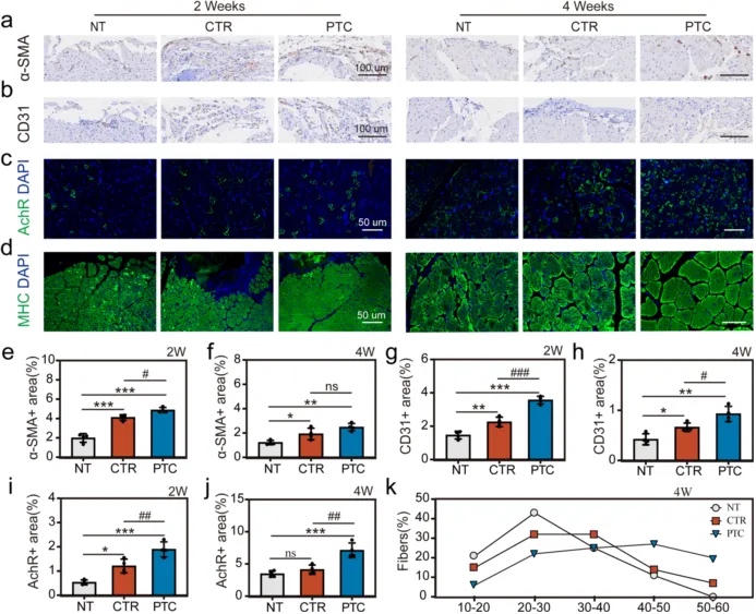 动物实验表明,该支架能在4周内有效促进新一代肌纤维、血管和神经的生成,促进大容量肌肉损失损伤的快速再生。