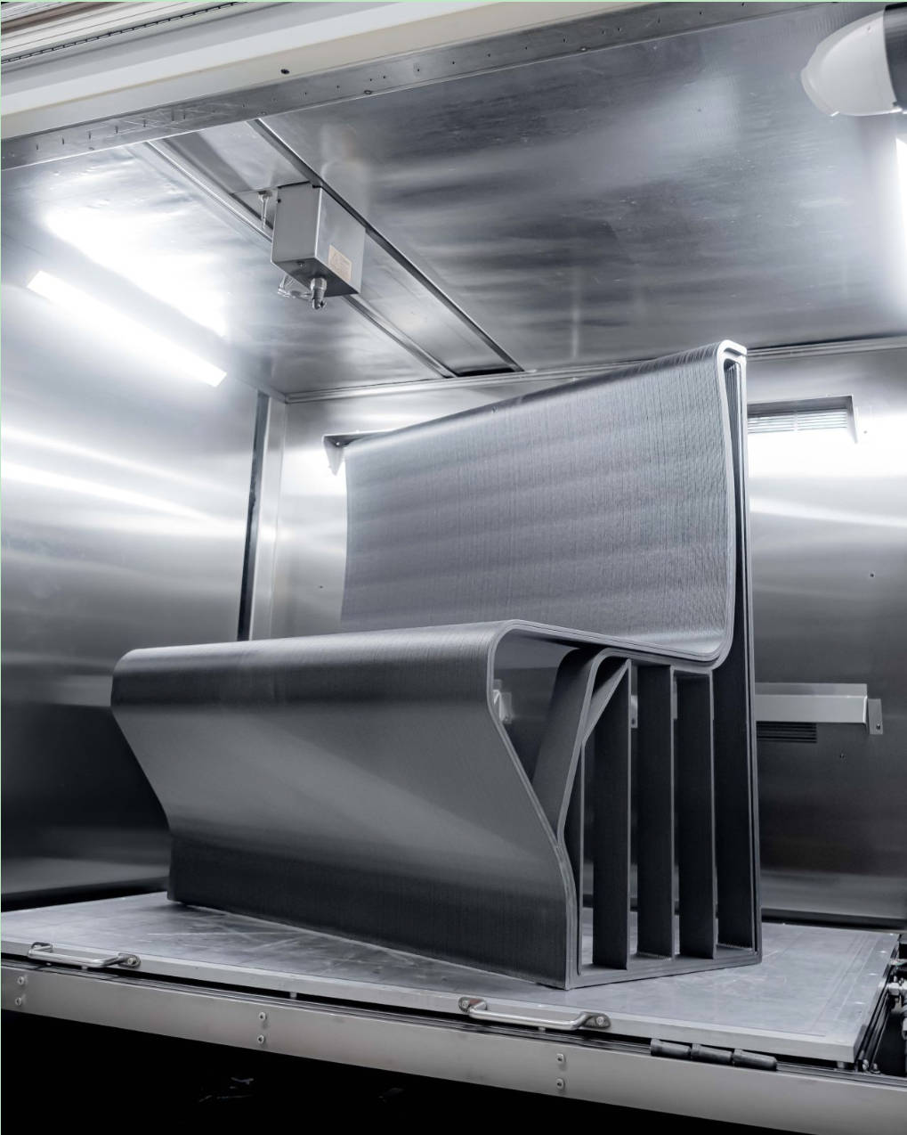 △ 一款为铁路行业设计的长椅,采用JuggerBot3D的Tradesman系列P3-44打印,使用符合NFPA和EN45545标准的20%碳纤维聚碳酸酯