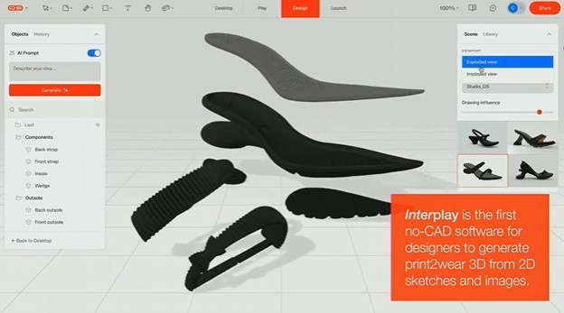 Hilos 的 Interplay 是首个无需 CAD 的平台,它允许用户创建设计并生成 3D 文件,以供 3D 打印和大规模制造。据 Stahl 介绍,用户可以按照自己喜欢的方式进行设计——无论是通过手绘、VR,还是Midjourney等工具——然后 Interplay 会生成3D 文件以供生产。该平台专注于高度系统化的产品,例如鞋类。