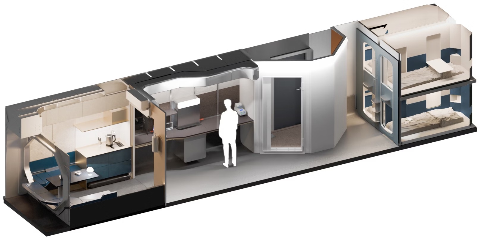 FLEXHab的实验室区域配备了可调节高度的桌子,并预留了专门空间用于未来国际标准有效载荷架(ISPR)模块,从而为适应不断变化的研究需求提供了灵活性。桌子和存储解决方案的关键组件采用3D打印技术制造,不仅减轻了重量,还增强了空间的适应性。