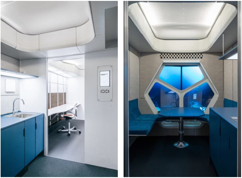 3D打印的舱壁和内部隔板优化了空间布局,在紧凑的居住舱尺寸内实现了平衡布局。FLEXHab使用3D打印材料制造关键结构部件,因此在必要时可以快速维修或更换,无缝适应不断变化的太空任务需求。在内部,3D打印元素的集成创造出多功能空间,以满足长期任务的各种需求。厨房区设计为主要的娱乐和用餐空间,配备Alcantara纯素麂皮座椅和可折叠的餐桌,这些餐桌可以整齐地收起,将该区域转换为配备存放设施的健身空间。