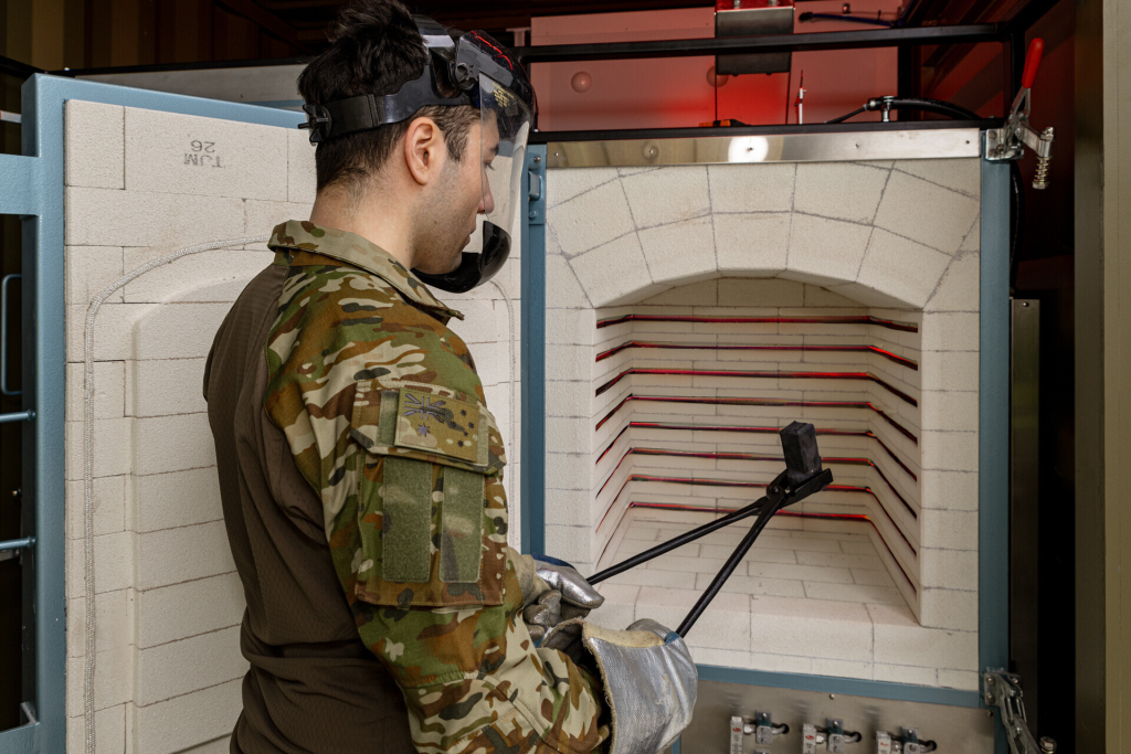 △陆军士兵从 SPEE3Dcell 炉中取出已完成热处理的离合器从动缸。照片来自 SPEE3D。