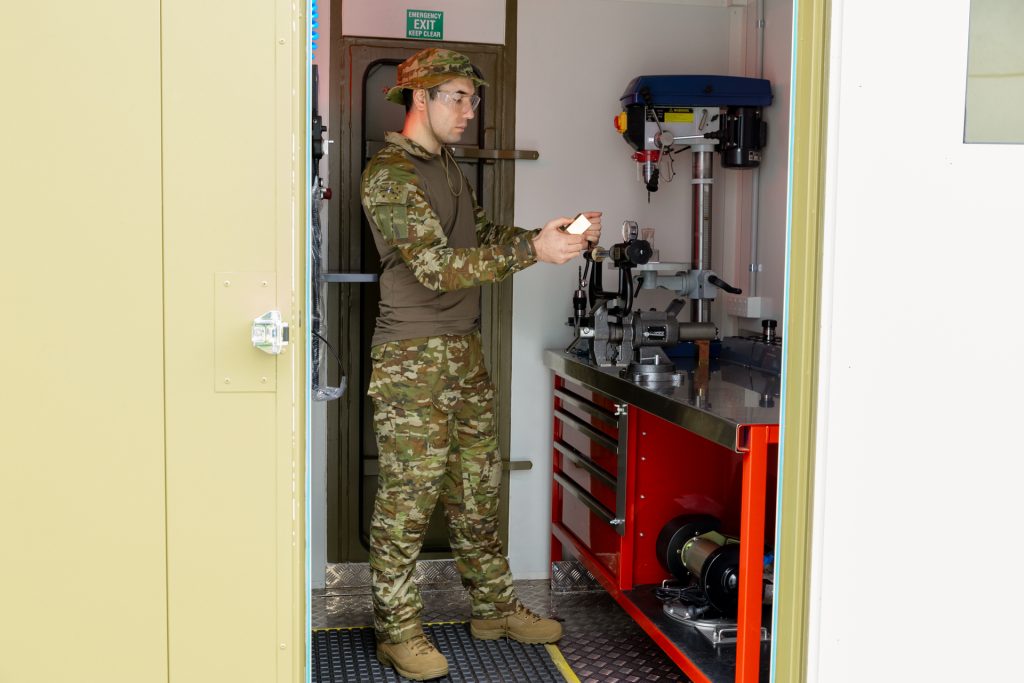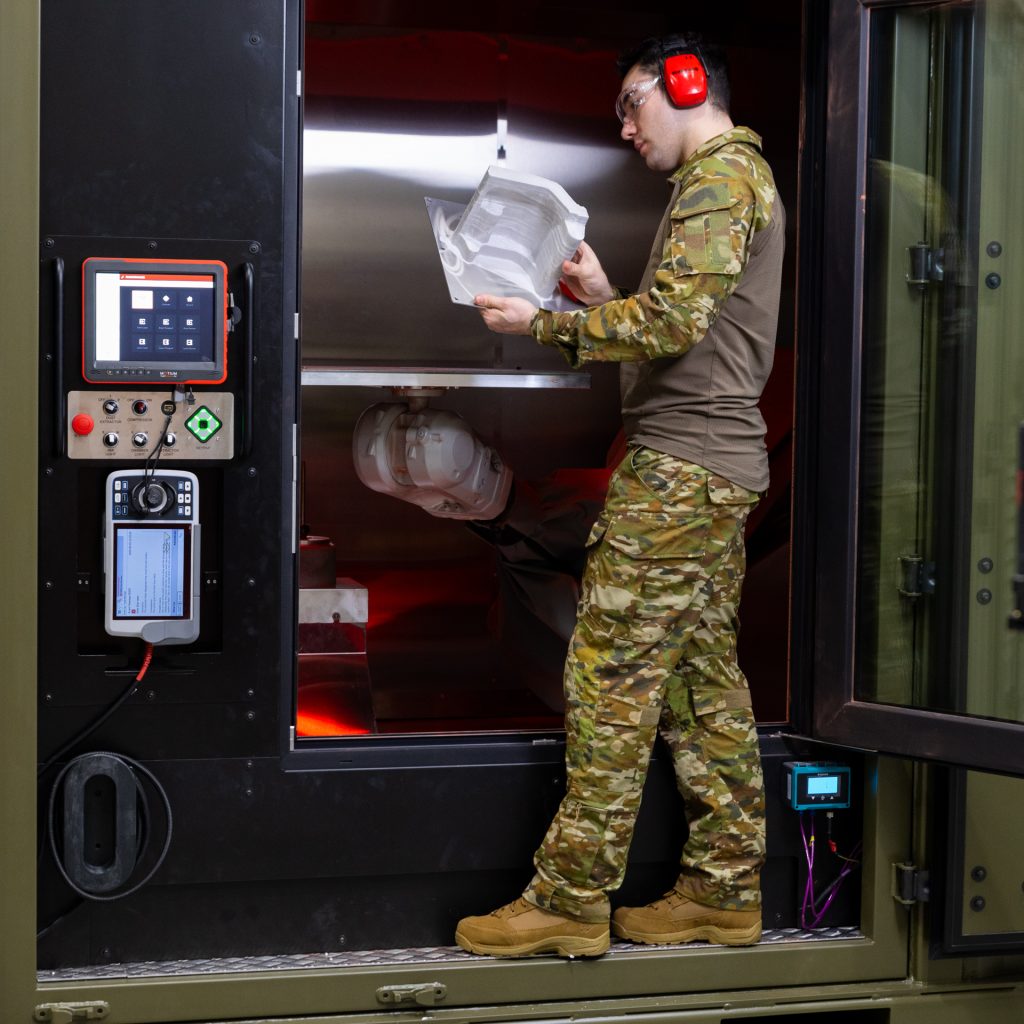 △陆军士兵在 SPEE3Dcell 的 CNC 和工具区内加工刚刚完成的离合器从动缸。照片来自 SPEE3D。