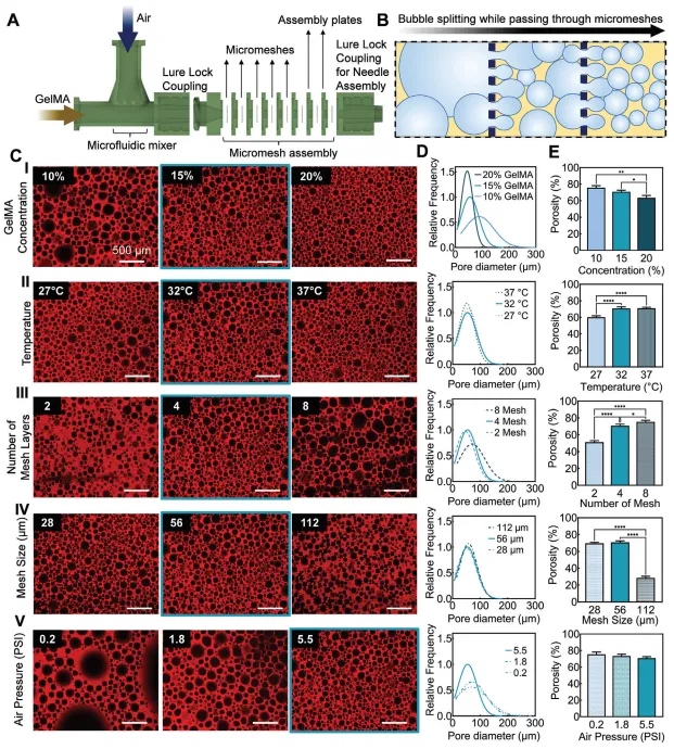 紧凑型微流控均质器被设计并制造出来,以便于水凝胶前体的一步式充气过程(图2A)。这些均质器通过组装三个部件制成:一个三通连接器、一个微网组件和用于连接的鲁尔锁接头。特别设计的三通连接器使用鲁尔锁接头进行快速连接;两个凸形鲁尔锁被用于水凝胶和空气输入,而一个下游凹形连接器被用于微网组件的附着(图2A)。空气通过一个包含三个通道的微流控混合器引入到水凝胶前体流中。本文的初步实验表明,这些通道比单通道设置更有效地引入并将空气混合入水凝胶流中,从而产生更均匀且质量更高的泡沫。第二个组件是微网组件,由多个尼龙微网组成,彼此间隔1毫米,用于顺序气泡分裂。在挤出含有大气泡的GelMA水凝胶前体通过微网组件时,水相轻松流过网格,而气泡经历剪切应力迫使它们顺序分裂,直到形成均匀细腻的GelMA泡沫为止(图2B)。这将在沉积和原位光交联后在支架中形成均匀的大孔。微网组件的配置,包括网孔大小和网层数量,决定了打印泡沫的孔隙率和孔径分布。通过改变进气压力和生物材料浓度、温度及前体挤出速率,可以进一步调节孔径和孔隙率。对孔隙结构的这种控制程度是非常宝贵的,也是这项工作相较于以往研究的主要优势之一。微流控均质器的最后一个组件是一个凹形鲁尔锁末端,用于快速连接到不同尺寸或形状的打印针头和喷嘴。