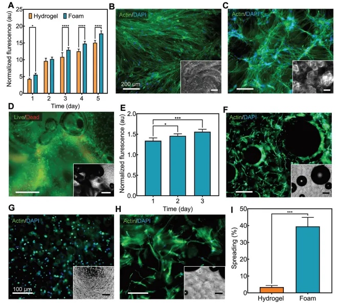 为评估多孔支架的生物特性,本文将这些支架暴露于人类真皮成纤维细胞(HDF)培养中。此处选择HDFs有三个特定原因:它们作为初级细胞对细胞毒性环境的敏感性、它们在再生医学中的人源相关性,以及它们对体内伤口愈合实验的适用性。首先,制作了支架,并在支架上播种了细胞以评估支架的生物行为。这项调查旨在仔细检查一步打印泡沫的生物相容性和适宜性,以用于容纳细胞,同时也在体外环境中反映本文最终的体内策略。对于细胞播种研究,使用PrestoBlue活性检测法评估了五天跨度内的细胞增殖和存活率。正如图5A所示,荧光强度测量表明,在五天的时间里,接受一步打印泡沫和实体水凝胶处理的细胞代谢活动呈现一致的线性增加。有趣的是,PrestoBlue检测显示,与实体水凝胶相比,播种在一步打印泡沫样本上的细胞表现出显著更高的增殖。增加的增殖可能是由于一步打印泡沫结构的多孔性质,为细胞生长提供了更多空间,并在3D构建物内促进细胞增殖。这种行为通过Actin/DAPI染色培养物得到了证实(图5B,C)。虽然实体水凝胶具有生物相容的表面,并有明显的细胞增殖和扩散,但其小的内在孔隙限制了细胞向水凝胶内的渗透,促使细胞在样本表面形成密集的平面层(图5B)。相反,培养在多孔支架上的HDFs形成了在三维中生长的多层结构,形成了细胞网络(图5C)。HDFs的非平面性质通过细胞向下生长进入孔隙中的聚焦丝状扩散显示出来,显微照片中较暗的部分显示了这一点。