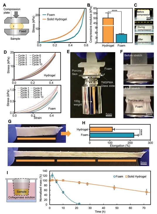 图4 一步打印法生产的泡沫与实体水凝胶的物理性能比较
