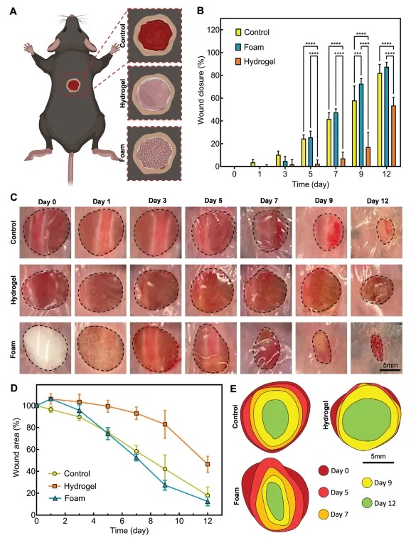图6 全层伤口的鼠模型,用于展示一步法打印泡沫在转化医学上的可行性和再生潜力
