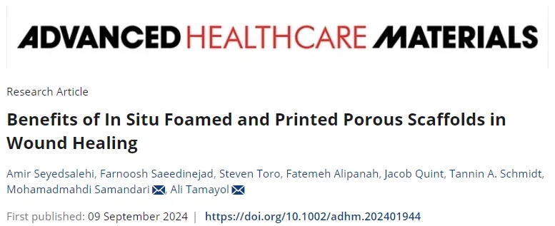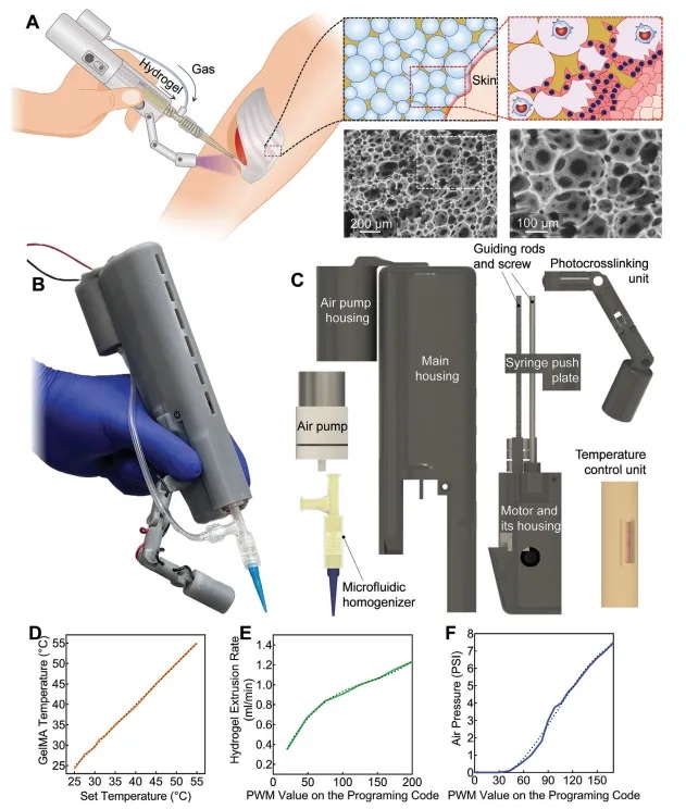 来自美国康涅狄格大学健康中心的 Ali Tamayol等团队开发了一种手持打印机,用于方便且连续地生成和沉积水凝胶泡沫,直接在皮肤缺损处形成特定于缺陷的大孔支架。在该手持系统中,一个温度控制的微流控均质器与微型液体和空气泵相结合,以所需比例将无菌空气与明胶甲基丙烯酰基(GelMA)混合。然后利用集成的光交联单元在原地交联打印的泡沫,形成具有控制孔隙率的支架。该系统被优化以形成可靠且均匀的GelMA泡沫。所得泡沫支架展现出优异的机械性能和灵活性,使它们适用于伤口愈合应用。体外细胞培养结果显示,与实体水凝胶相比,支架上的细胞活性显著增加。体内打印的泡沫支架提高了小鼠全层伤口的愈合速度和质量,无需使用生物材料。相关工作以题为“Benefits of In Situ Foamed and Printed Porous Scaffolds in Wound Healing”的文章发表在2024年09月09日的期刊《Advanced Healthcare Materials》。