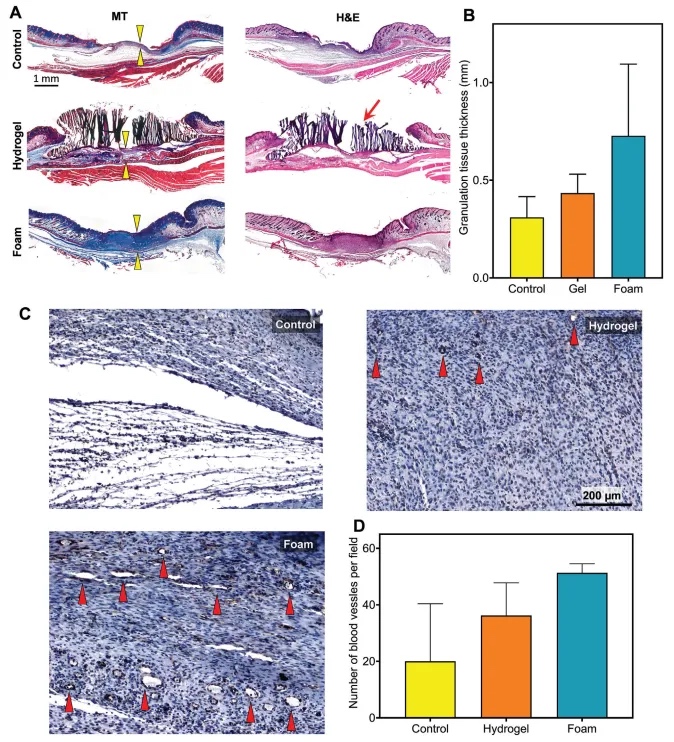 在实验的第12天结束时,进行了组织学分析以评估伤口愈合的质量(图7)。苏木精和伊红(H&E)以及马松三色(MT)染色(图7A)显示所有组都有愈合的证据。然而,用泡沫处理的伤口显示出更成熟和先进的愈合迹象,如较厚的肉芽组织和毛囊的生长更多地向缺损中心进展所证明。相反,水凝胶组中的实体水凝胶通过物理阻挡伤口边缘的进展而阻碍了伤口闭合(图7A,红色箭头)。这证实了本文的假设,即实体水凝胶具有较慢的生物降解性,不允许细胞轻易渗透和支架重塑,而通过应用大孔泡沫支架可以解决这一问题。肉芽组织厚度的定量测量确认了相同的模式,即用一步法打印的大孔泡沫处理的伤口倾向于形成更厚的肉芽,尽管这种差异没有达到统计学意义(图7B)。