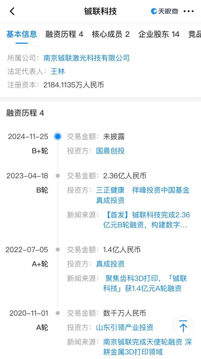 2024年12月9日,齿科3D打印厂商南京铖联激光科技有限公司(以下简称:铖联科技)近日完成了B+轮融资,投资方为国晨创投,具体投资金额暂未披露。