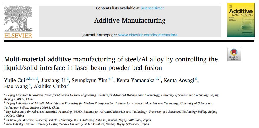 2024年12月,日本东北大学(Tohoku University)材料研究所和新产业创造孵化中心的研究人员在多材料3D打印技术上取得了重要进展。他们开发了一种制造工艺,能够创建既轻便又耐用的汽车零部件,展示了通过增材制造(即3D打印)将不同材料如铝和钢结合在一起以优化汽车零件性能和效率的巨大潜力。他们的研究已经发表在“Additive Manufacturing”上,题目为《Multi-material additive manufacturing of steel/Al alloy by controlling the liquid/solid interface in laser beam powder bed fusion》(通过控制激光束粉末床熔合中的液/固界面进行钢/铝合金多材料增材制造)