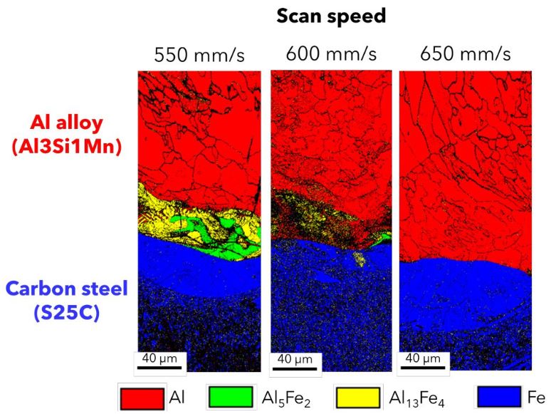为了解决这一问题,研究团队采用了激光粉末床熔融(L-PBF)技术,这是金属3D打印中的关键技术之一。该方法利用激光选择性地熔化金属粉末,逐层构建物体。经过一系列实验,团队发现提高激光扫描速度可以显著抑制脆性化合物如Al5Fe2和Al13Fe4的形成。研究表明,较高的扫描速度触发了非平衡凝固现象,减少了溶质分离,从而避免了材料内部出现弱点。最终得到的钢-铝合金展现出强大的界面结合力,兼具轻量化和高耐久性的特点。
