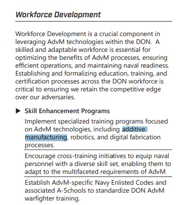 通过采用增材制造、先进加工和快速原型等尖端技术,海军和海军陆战队能够克服传统制造的局限性,增强供应链的韧性,并适应快速变化的全球环境。