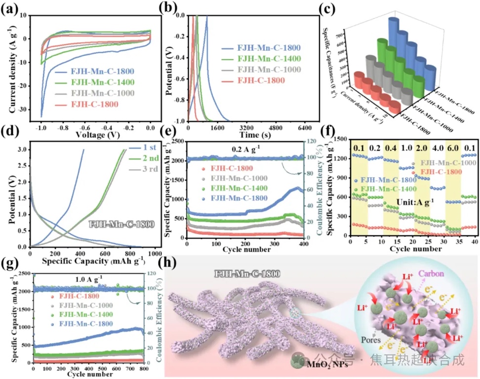 3. 锂离子电池的出色表现:FJH-Mn-C-1800作为锂离子电池负极材料,在0.2 A g⁻¹电流密度下初始容量达到891.5 mAh g⁻¹,经过400次循环后仍保持570.9 mAh g⁻¹的容量。其高性能得益于多孔碳纤维的高导电性和均匀分布的MnO2纳米颗粒。