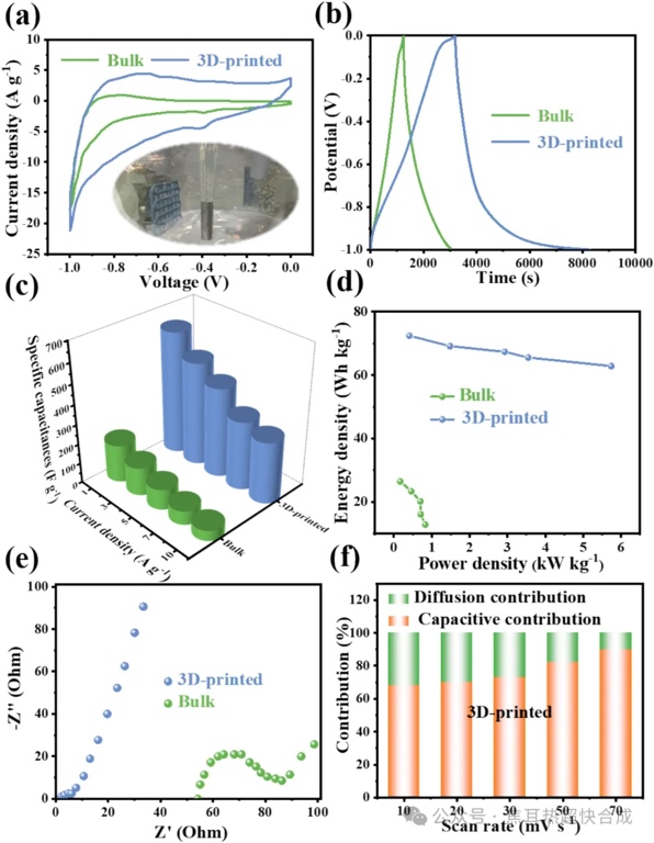4. 3D打印电极的全面优势:相比传统涂覆电极,3D打印电极不仅在结构设计上更灵活,且具有更高的离子扩散效率和导电性能。在10 A g⁻¹电流密度下,比电容达309.6 F g⁻¹,能量密度为72.5 Wh kg⁻¹,远超传统制备方法。