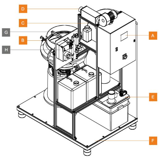 △SurfPro SD机器的3D图;A-用于程序和配方管理的 HMI 触摸屏;B-带盖振动桶,适用于蒸汽和热风干燥;C-干饱和蒸汽锅炉;D-热风机干燥;E-带三通控制阀和电动泵的回收/恢复罐;F-自支撑托盘框架,即插即用安装;G-彩色容器;H-用于 1 种凝胶化合物和 1 种化学化合物的配料站,配有电磁阀和流量计;