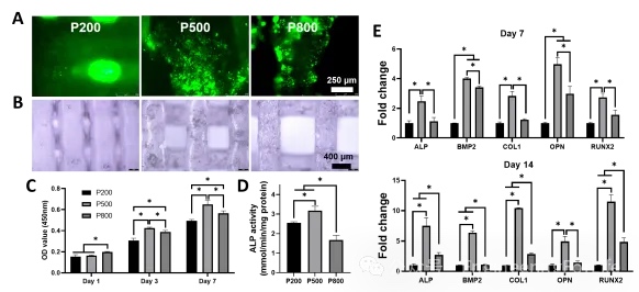 如图11所示,大孔径似乎更能促进MP向M2表型极化。相比P300,P500和P800显著上调CD206和ARG的表达,同时,第一天的ARG表达P500>P800,而其他情况下P500和P800无显著差异。P200诱导炎症基因(TNF-α、IL-1β)的表达最显著,P800次之,P500显示出显著的抑制效果。P200和P800促MP极化的能力弱于P500,这可能也是支架性能和细胞渗透未达到最佳平衡所致。在MP条件培养基的介导下,在各个时间点上,P500显著上调成骨基因的表达,P800的体外免疫成骨性能要优于P200。同样的,在ALP的染色和定量中,P500表现最显著的活性。
