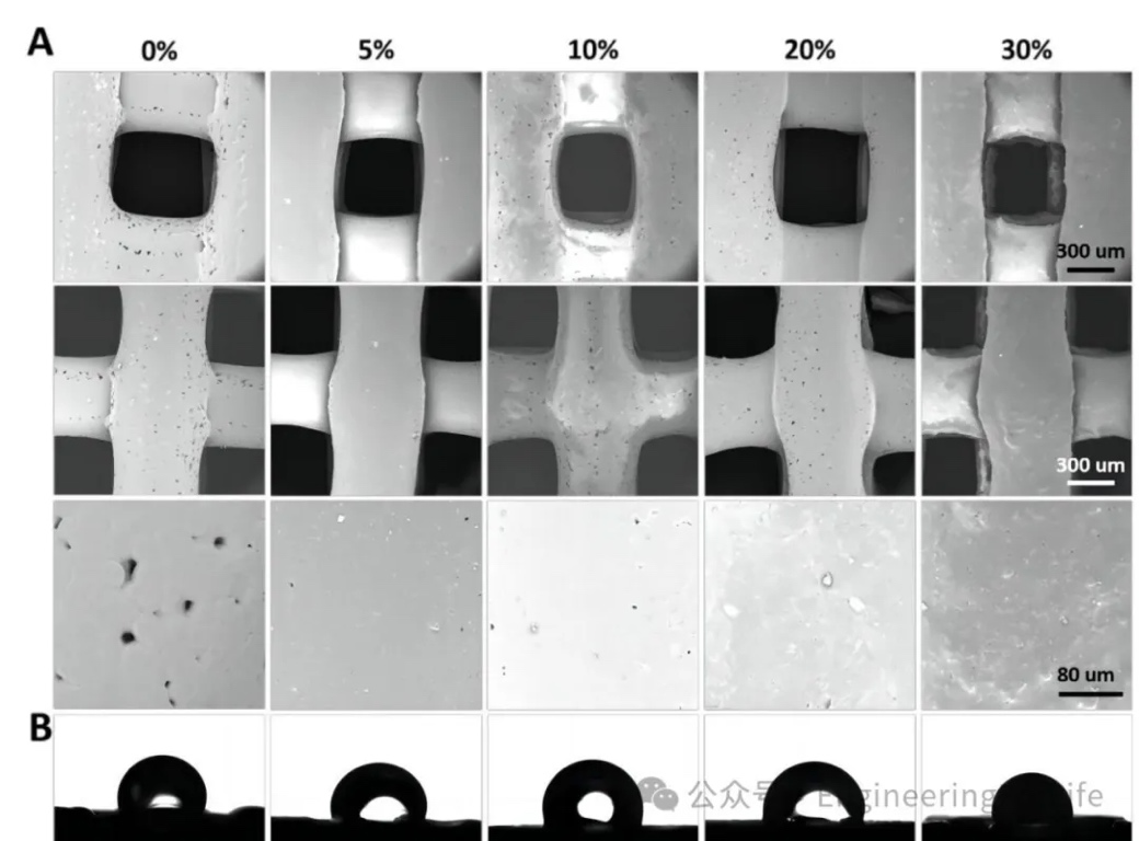 各组支架均出现PCL的特征峰,其中2850-3000cm-1处–(CH2)4–为CH伸缩振动,1750cm-1处是C=O伸缩振动峰,1150-1250cm-1代表-C-O-。随着MBG含量的增加,PCL原有的特征峰逐步降低。通过对各组支架进行热重分析,支架剩余无机颗粒的质量与混入MBG的比例基本一致。在支架的抗压缩性能测试中,我们可以看到随着MBG含量的增加PCL的抗压能力逐渐增强。以10%最显著。但在此基础上,随着MBG含量的增加支架的抗压强度逐步下降。20%和30%支架在达到抗压峰值后迅速坍塌。这是因为PCL包裹MBG颗粒类似于“海-岛”结构。我们推测,当MBG(“岛”组分)含量进一步增大时,对PCL(“海”组分)的整体连接性能产生了不利的影响,进而降低支架的最大抗压强度。同时,较大比例的MBG在PCL中团聚,使得抗压形变过程中受力不均导致支架整体坍塌。