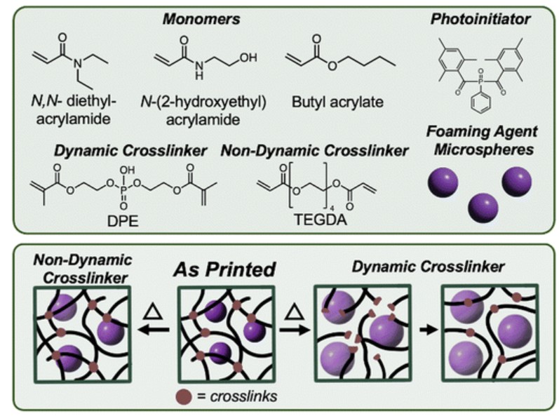 上图:打印泡沫的树脂成分包括单体和动态(DPE)或非动态(TEGDA)交联剂;下图:打印后,发泡剂微球仍被困在交联网络中。加热后,微球膨胀形成闭孔泡沫材料。使用非动态交联剂时,球体的膨胀受到聚合物链内可用空间的限制。相反,对于动态网络,键可以在发泡过程中重新排列,从而允许更大的膨胀,同时保持交联密度。