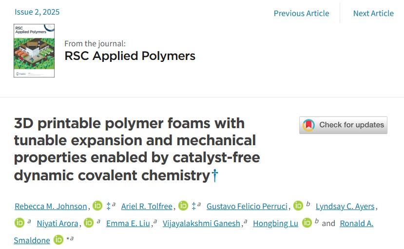 这项研究以题为“3D printable polymer foams withtunable expansion and mechanical properties enabled by catalyst-free dynamiccovalent chemistry”的论文发表在《RSC Applied Polymers》期刊上,重点是制造一种可以 3D 打印的坚固但轻巧的泡沫。