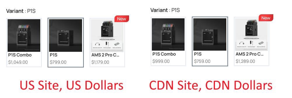 拓竹3D打印机P1S 价格为 799 美元(美国,相当于1111加元)对 749 加元(加拿大)