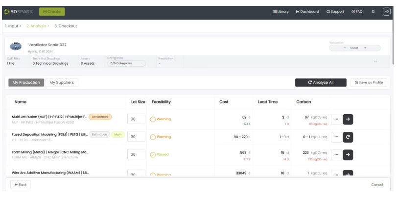 作为专注B2B领域的SaaS平台,3D Spark通过人工智能技术整合产品设计、制造工艺和采购管理三大环节,为企业提供端到端的数字化决策支持。核心优势在于兼容超过15种增材制造与传统工艺(涵盖金属/聚合物/陶瓷材料),可实时进行可制造性评估、成本核算、供应商比价及碳足迹分析,帮助西门子交通、德国铁路等全球巨头缩短采购周期30%-50%,平均降低零部件成本15%。