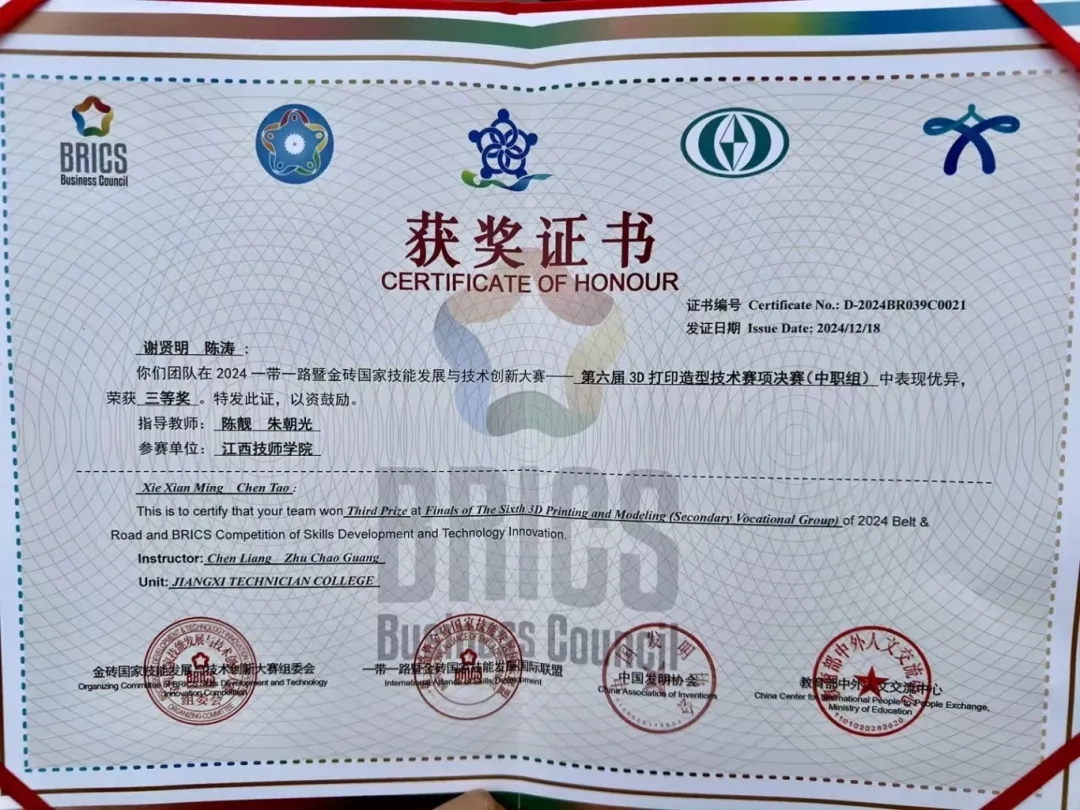 2024一带一路暨金砖国家技能发展与技术创新大赛3D打印造型技术赛项决赛获三等奖