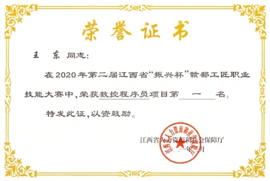 2020年参加第二届江西省“振兴杯”赣鄱工匠职业技能大赛“数控程序员”赛项获“第一名”;