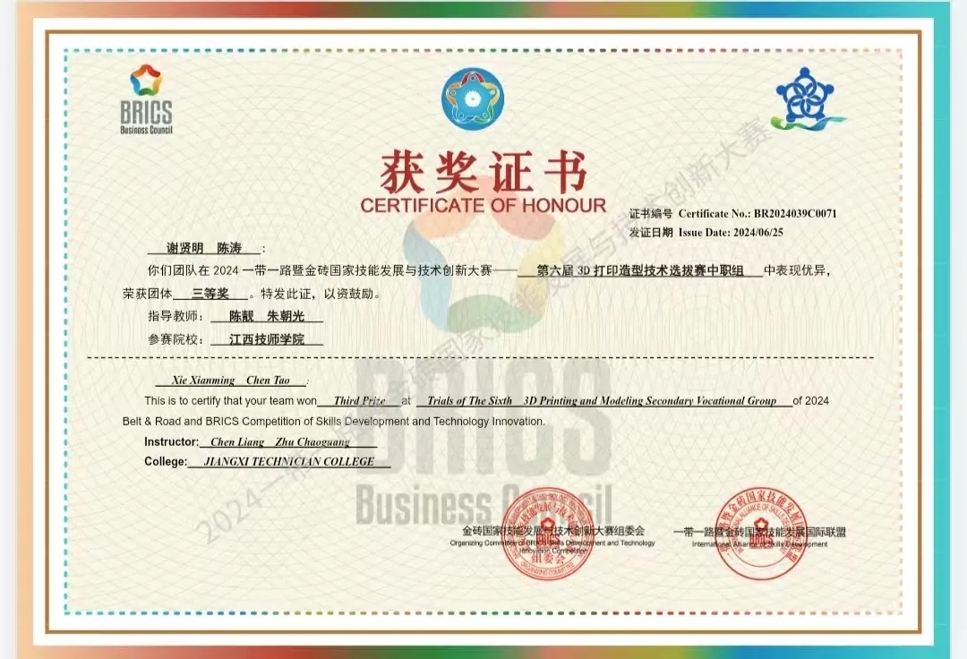 2024一带一路暨金砖国家技能发展与技术创新大赛3D打印造型技术赛项选拔赛(学生组)获三等奖