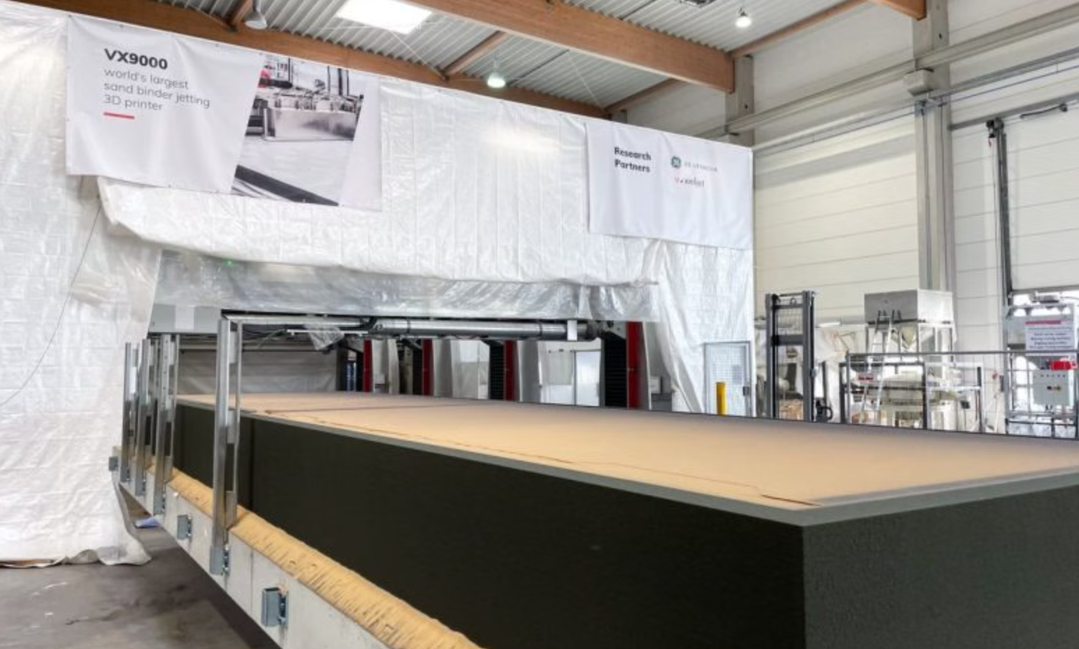 2025年5月23日,GE 公司采用全球最大的粘合剂喷射 3D 打印机——voxeljet 的VX9000系统,已成功打印 20 个基准砂模,每个砂模的作业箱长度可达 9.5 米。这些砂模现已进入铸造阶段,将被转化为清洁能源生产所必需的大型金属部件。VX9000展示了增材制造技术如何能够扩展到前所未有的尺寸,同时保持精度和成本效益。