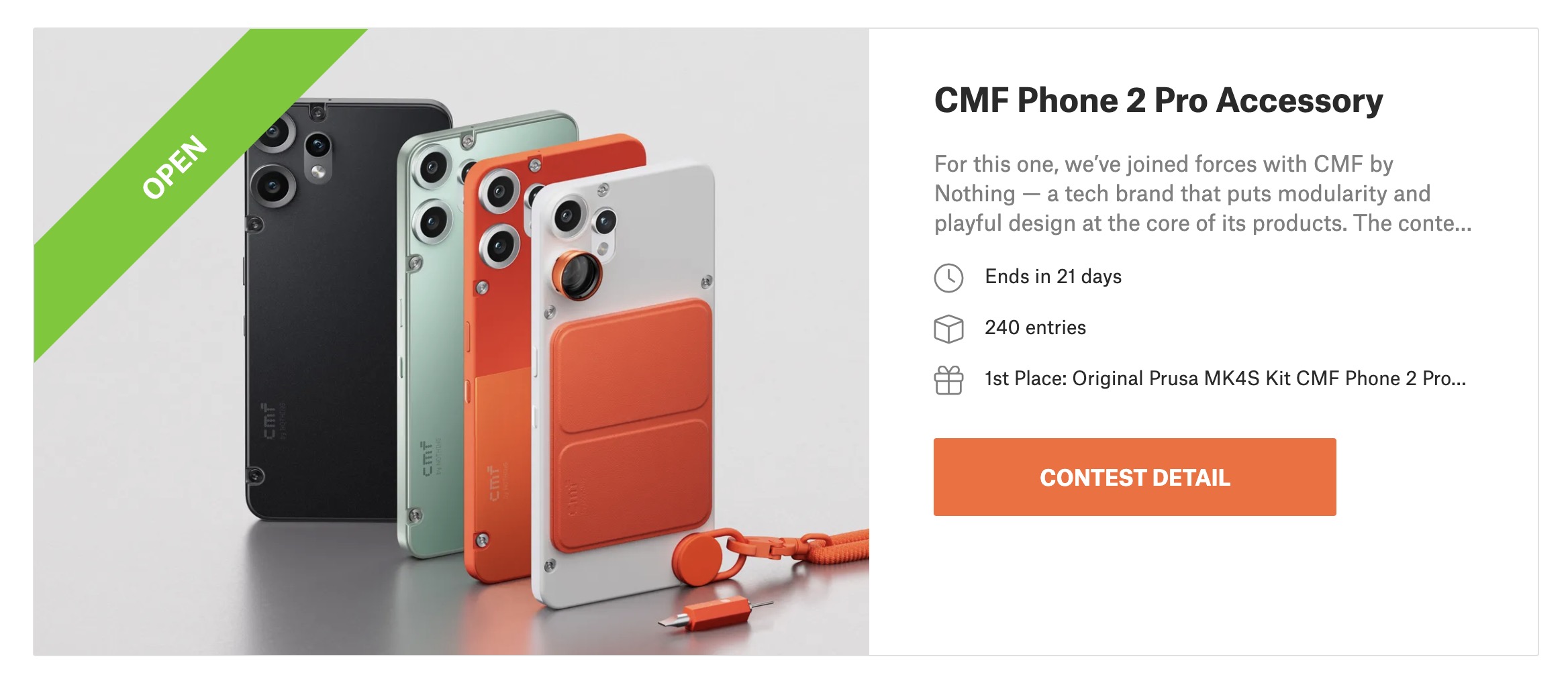 CMF团队表示:“我们与Prusa的合作伙伴携手,围绕CMF Phone 2 Pro以及全新通用保护套,发起了一项设计挑战赛。最优秀的参赛者将能够使用全新的CMF Phone 2 Pro和原装Prusa MK4S 3D打印机,将他们的设计变为现实。此外,还有更多奖品等您赢取。”