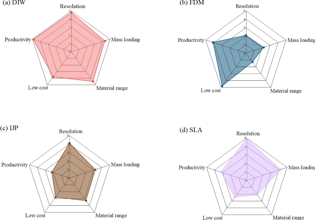 图2为四种主要3D打印技术示意图,包括直接墨水写入(DIW)、熔融沉积成型(FDM)、立体光刻(SLA)和喷墨打印(IJP),这些技术各具特点和适用场景。