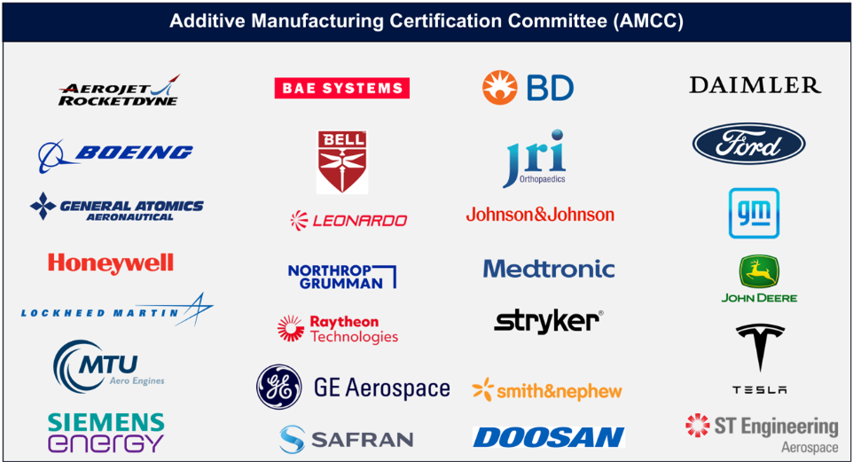 AMCC委员会汇聚了航空航天、国防、医疗设备、汽车、能源和重工业领域的原始设备制造商 (OEM)。参与者包括波音、通用电气航空航天、美敦力、福特、西门子能源和新科工程航空航天等主要制造商,这些公司代表了在受监管和生产关键领域大规模采用增材制造技术的公司。