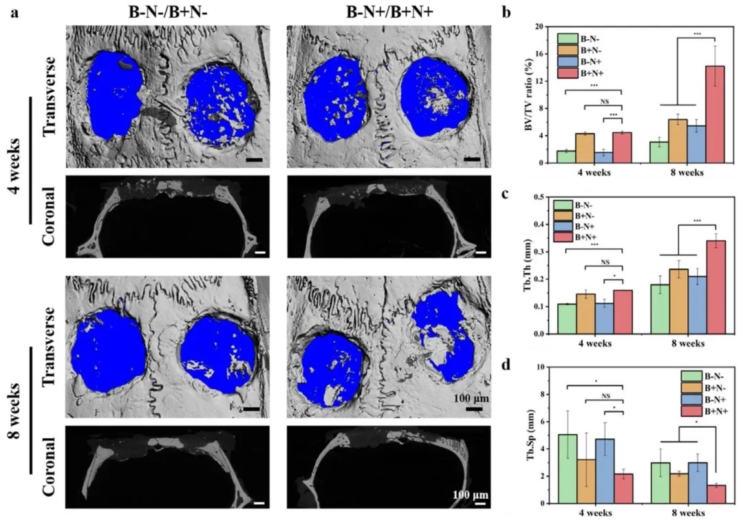 6. 体内骨再生与神经再支配评估 通过大鼠颅骨5mm临界缺损模型,结合Micro-CT三维重建、H&E染色、Masson三色染色及β-tubulin/OCN免疫荧光,研究了支架的体内疗效。结果显示,8周时B+N+组BV/TV(骨体积/总体积)和Tb.Th(骨小梁厚度)最高,Tb.Sp(骨小梁间距)最小,新生骨与宿主骨整合紧密,β-tubulin阳性神经纤维侵入缺损中心,OCN阳性成骨区域显著扩大,表明双因子协同促进神经-骨再生耦合。