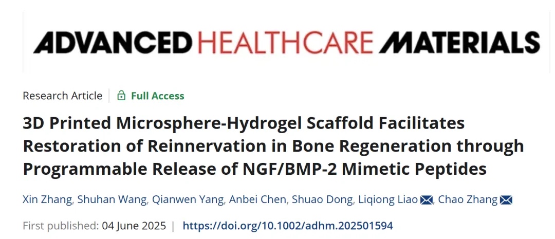 来自中山大学深圳校区生物医学工程学院的张超教授团队与南方医科大学材料研究中心的廖立琼教授团队合作,设计并构建了一种3D打印微球-水凝胶支架,通过聚乳酸-羟基乙酸共聚物(PLGA)微球包封BMP-2模拟肽、水凝胶基质负载NGF模拟肽,实现了NGF模拟肽的快速释放和BMP-2模拟肽的长期缓释。该支架通过可编程释放生长因子模拟肽,促进神经网络重建和骨再生,并深入探究了神经-骨串扰的分子机制。相关工作以“3D Printed Microsphere〩ydrogel Scaffold Facilitates Restoration of Reinnervation in Bone Regeneration through Programmable Release of NGF/BMP-2 Mimetic Peptides”为题发表在《Advanced Healthcare Materials》上。