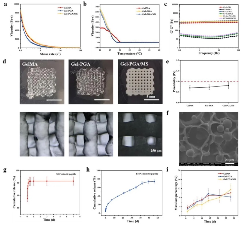 1. 墨水流变性能与支架表征,通过流变测试(剪切速率、温度、频率对粘度及模量的影响)、扫描电子显微镜(SEM)观察、释放曲线测定及力学性能测试等方法,研究了含GelMA、mPGA及PLGA微球的打印墨水特性及3D打印支架性能。结果表明,墨水呈非牛顿流体剪切变稀特性,20°C时粘度适宜打印,支架结构完整、孔隙清晰,PLGA微球均匀分散于丝材中;NGF模拟肽3天累计释放82.94±6.75%,BMP-2模拟肽通过微球-水凝胶静电作用实现8周74.31±3.86%持续释放,压缩强度和肿胀率分别达优化水平,4周水解失重约11.51±2.58%。