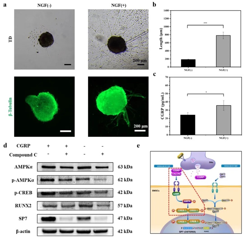 5. 神经-骨串扰分子机制 通过ELISA检测CGRP浓度、Western blotting分析信号蛋白,研究了NGF模拟肽调控成骨的机制。结果显示,NGF模拟肽显著提升DRGs培养上清中CGRP浓度,激活AMPK和CREB1磷酸化,进而上调成骨转录因子SP7;抑制AMPK(Compound C处理)可阻断该通路,证实其通过CGRP-AMPK-CREB1-SP7轴促进成骨,与BMP-2模拟肽的Smad通路形成协同。