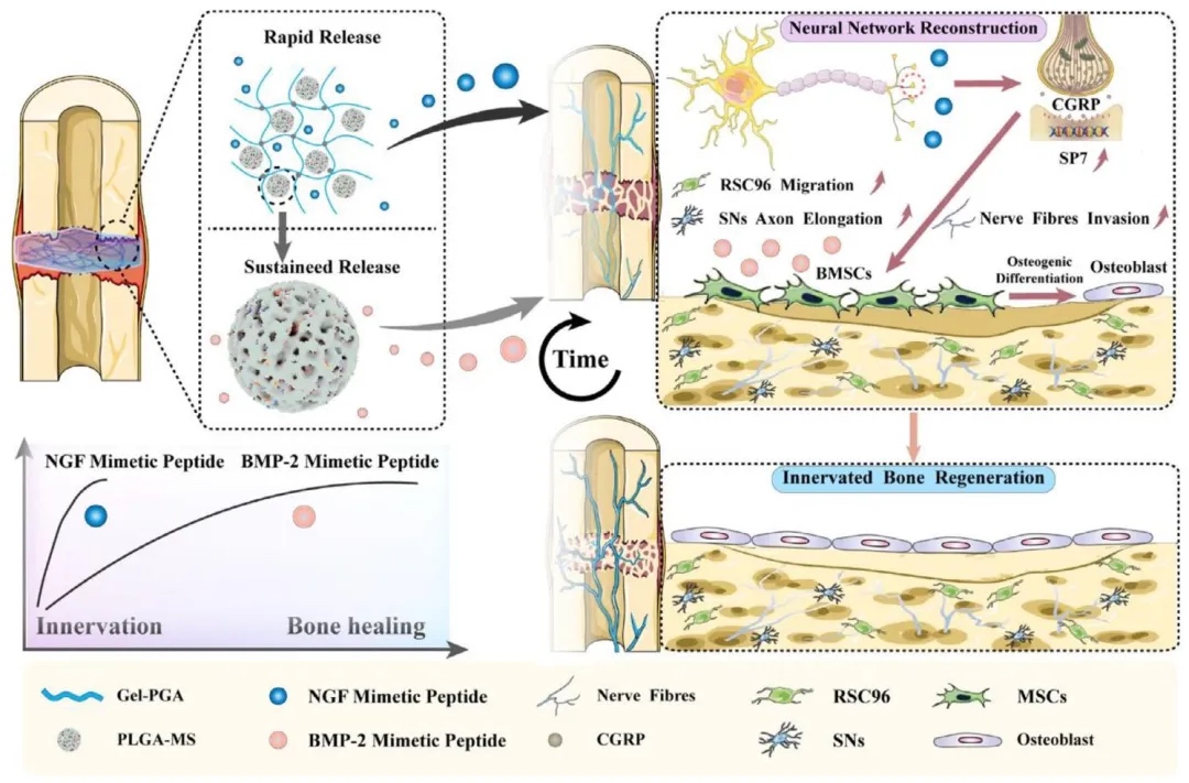 3D打印微球- 凝胶支架通过可编程释放 NGF/BMP-2 模拟肽促进骨再生中的神经再支