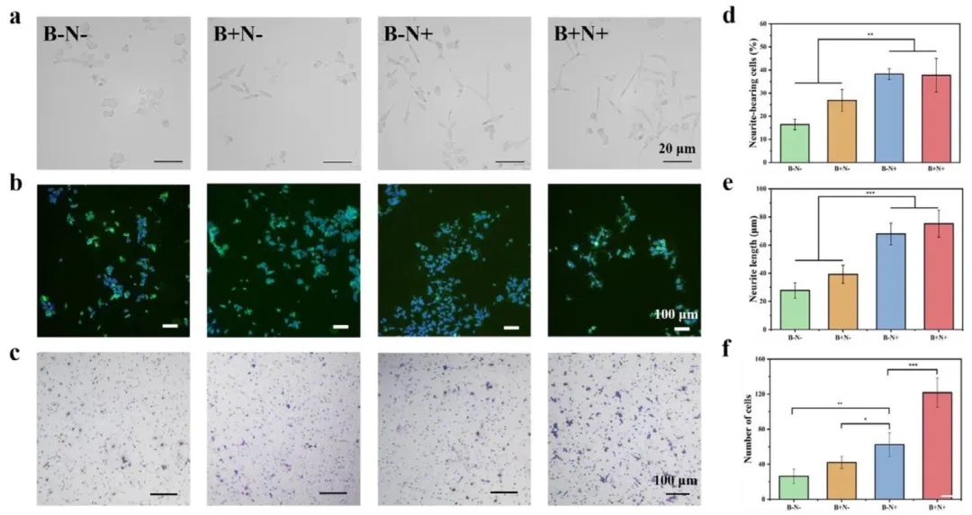 2. 体外神经分化能力 通过PC12细胞(肾上腺嗜铬细胞瘤细胞)神经突分化染色、RSC96细胞(施万细胞)Transwell迁移实验及免疫荧光定量分析,研究了支架提取物对神经细胞的作用。结果显示,含NGF模拟肽的B-N+和B+N+组诱导PC12细胞形成长轴突(神经突长度显著增加),神经突阳性细胞比例提升;B+N+组RSC96细胞迁移数量最多,证实NGF模拟肽快速释放可加速神经网络形成,BMP-2模拟肽亦有协同促进作用。
