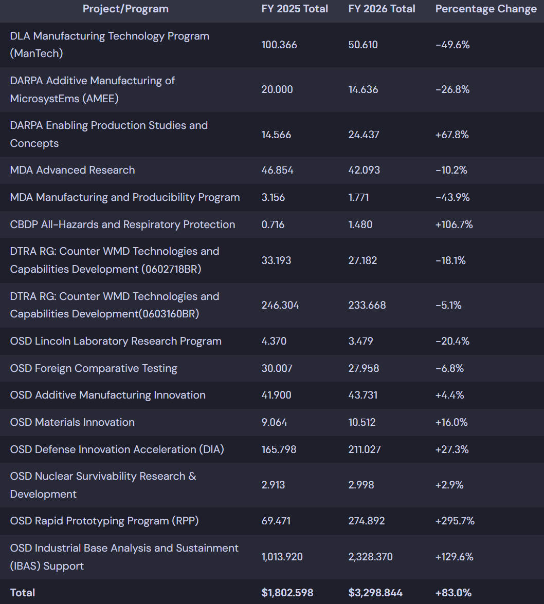国防高级研究计划局(DARPA)微系统增材制造(AMEE)和国防部增材制造创新项目的总预算为5,840万美元,较2025财年的6,190万美元,同比下降5.7%