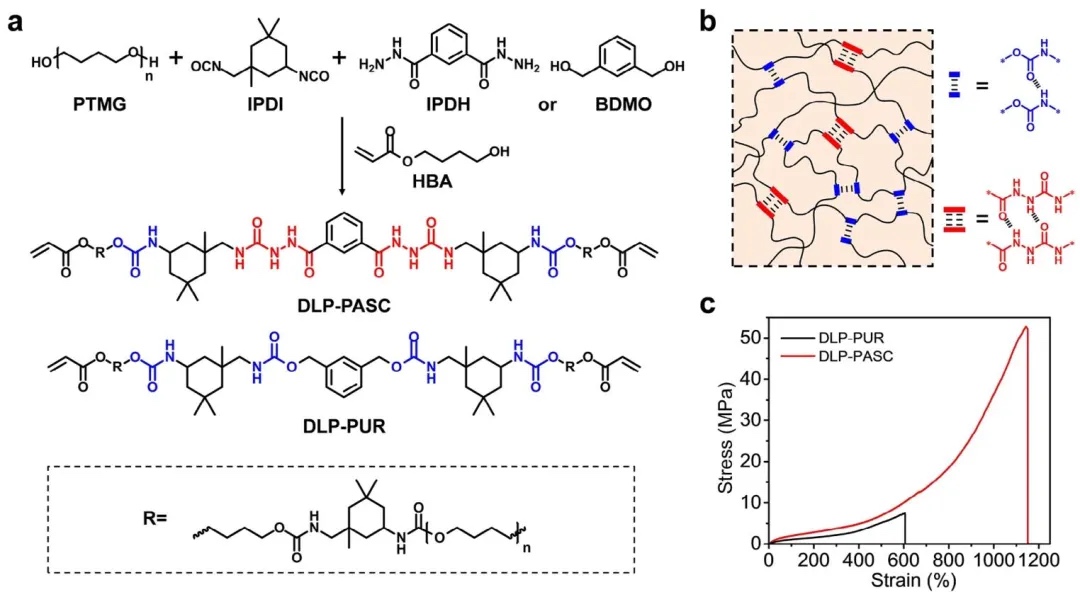 1、分级氢键弹性体设计:将酰基氨基脲和氨基甲酸酯引入光活性树脂,制备超韧且可自修复的3D打印弹性体。