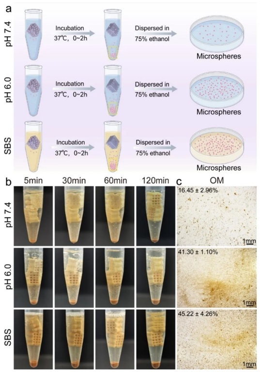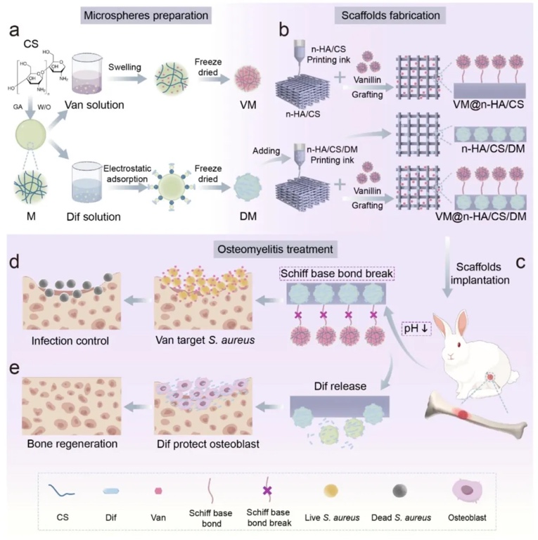 通过水-油乳化法制备载药微球,结合3D打印技术与范醛交联工艺,研究VM@n-HA/CS/DM支架的构建流程及治疗机制,结果表明该支架通过pH敏感希夫碱键连接VM至表面,DM分散于基质中,可在酸性环境释放万古霉素杀菌,同时持续释放双氯芬酸保护成骨细胞。