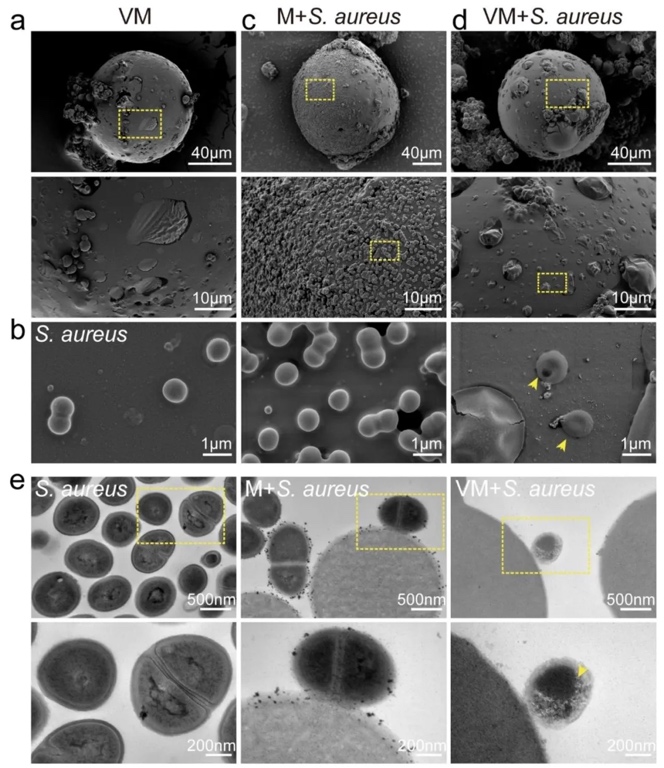通过扫描电镜和透射电镜观察细菌与微球的相互作用,研究VM的抗菌机制,结果表明VM通过静电作用吸附细菌,导致细菌膜破裂、细胞质泄漏,而单纯壳聚糖微球仅吸附细菌不杀菌。